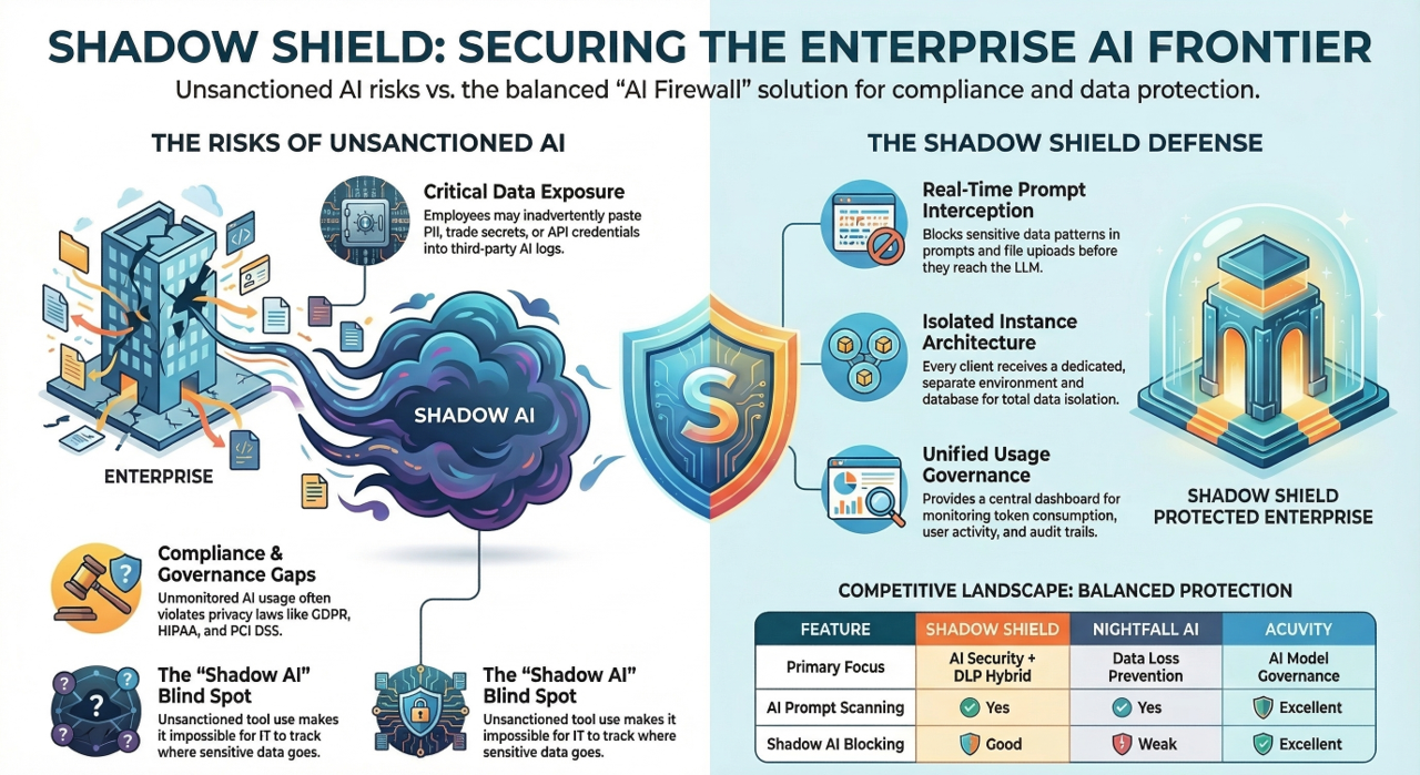 ShadowShield: Acting as your "AI Customs Agent," it sits between employees and AI models, performing lightning-fast, real-time inspection to block or surgically redact sensitive information